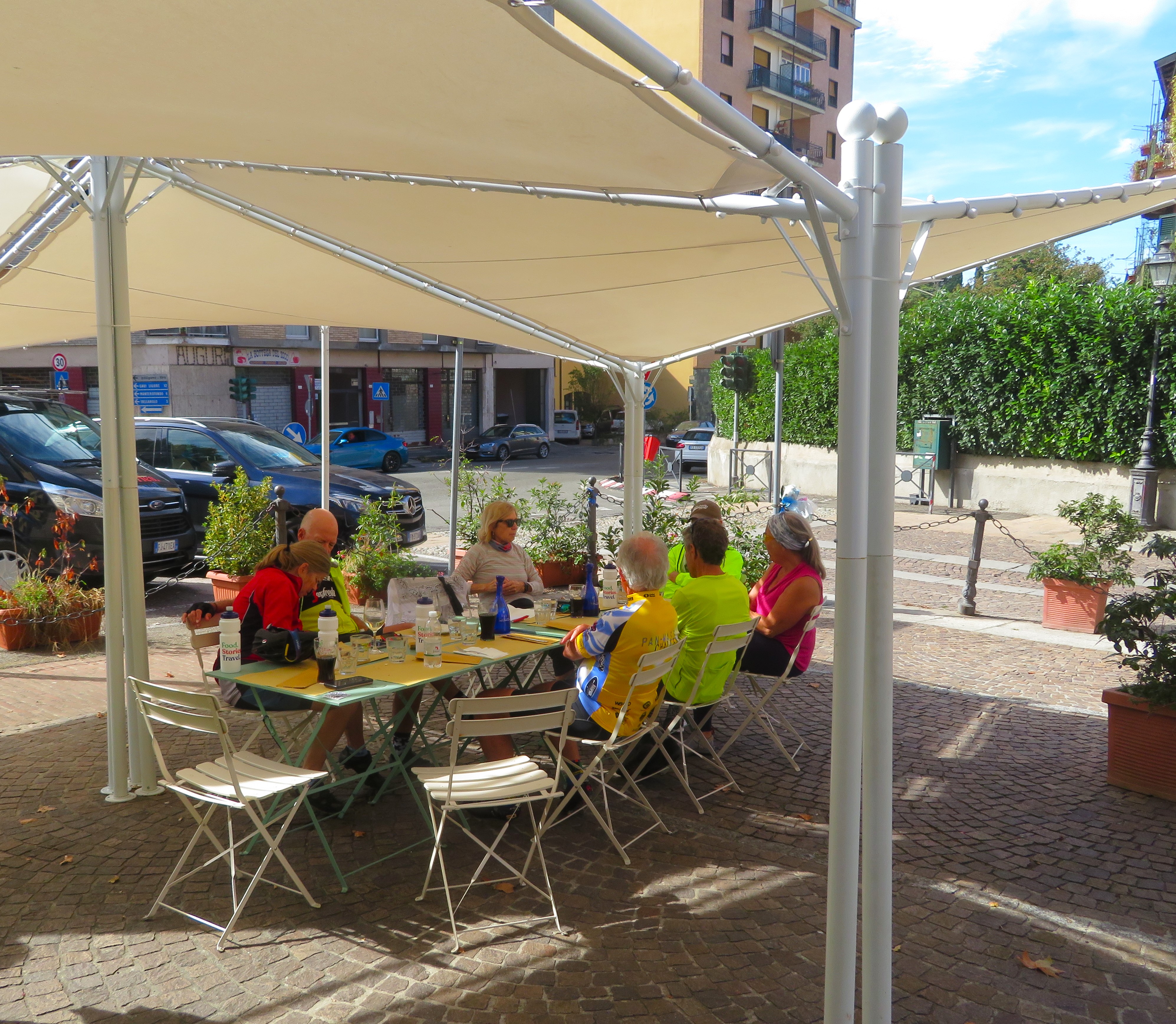 And then our waiter asks us what we’d like for lunch. Some of us ordered a small pizza. Others got a mixed salad, which was the better choice. By the time we were ready to go, we were so full of carbs that the afternoon’s long ride was welcomed. We had seven miles to go, the last two were on a street in the middle of vineyards.