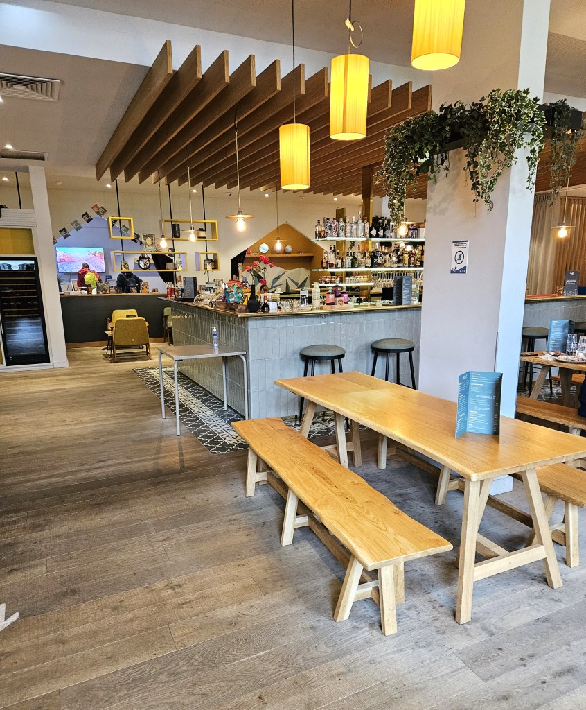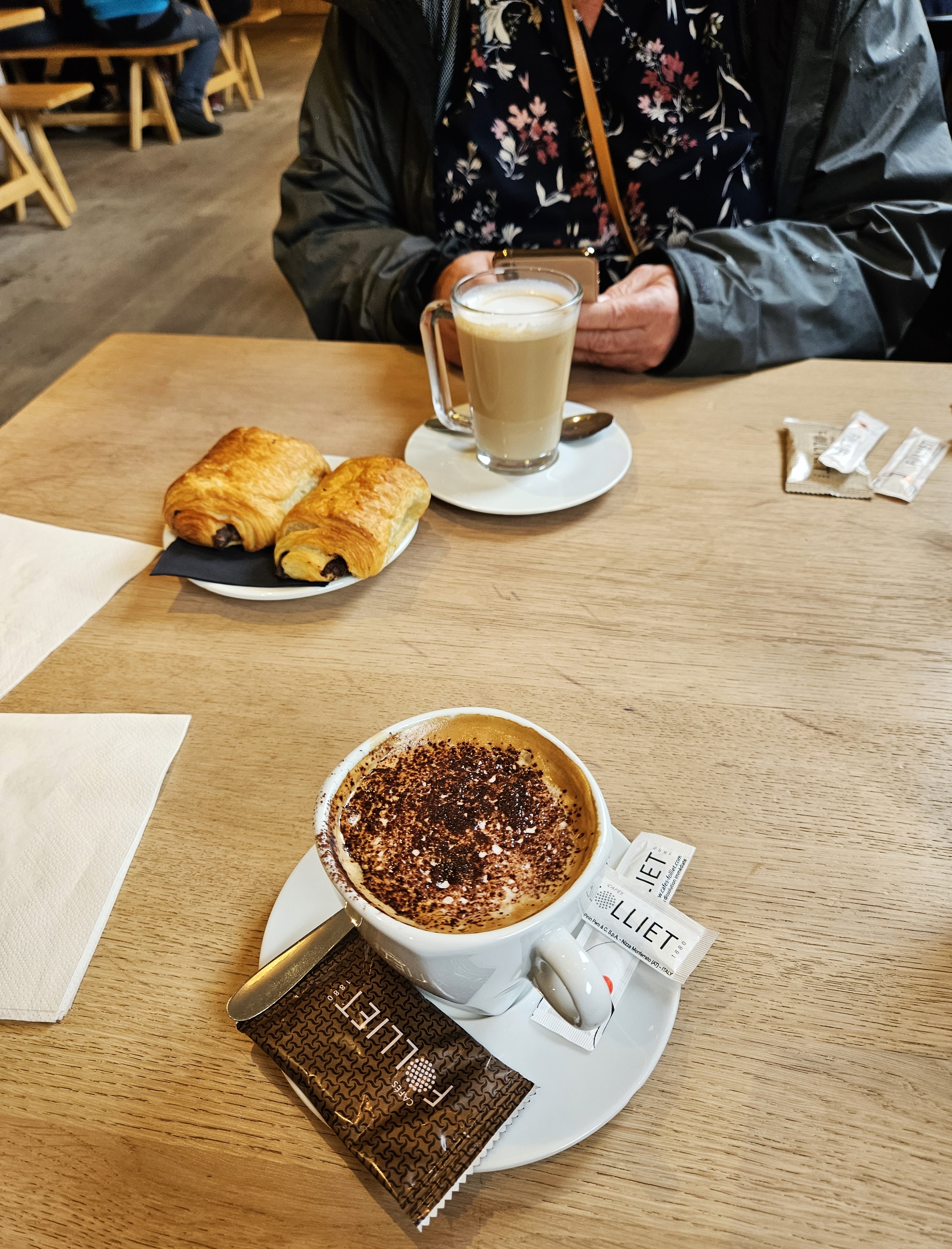 An hour later, we’re in Chamonix (it takes that long to get to the tunnel and through it) and the first order of business is to find a place for a warm coffee drink and use the restroom. And we did. Next to the bus stop is a hotel/restaurant/bar called Plan B and it was perfect! Joyce and I enjoyed a cappuccino, a caffe latte and croissants.