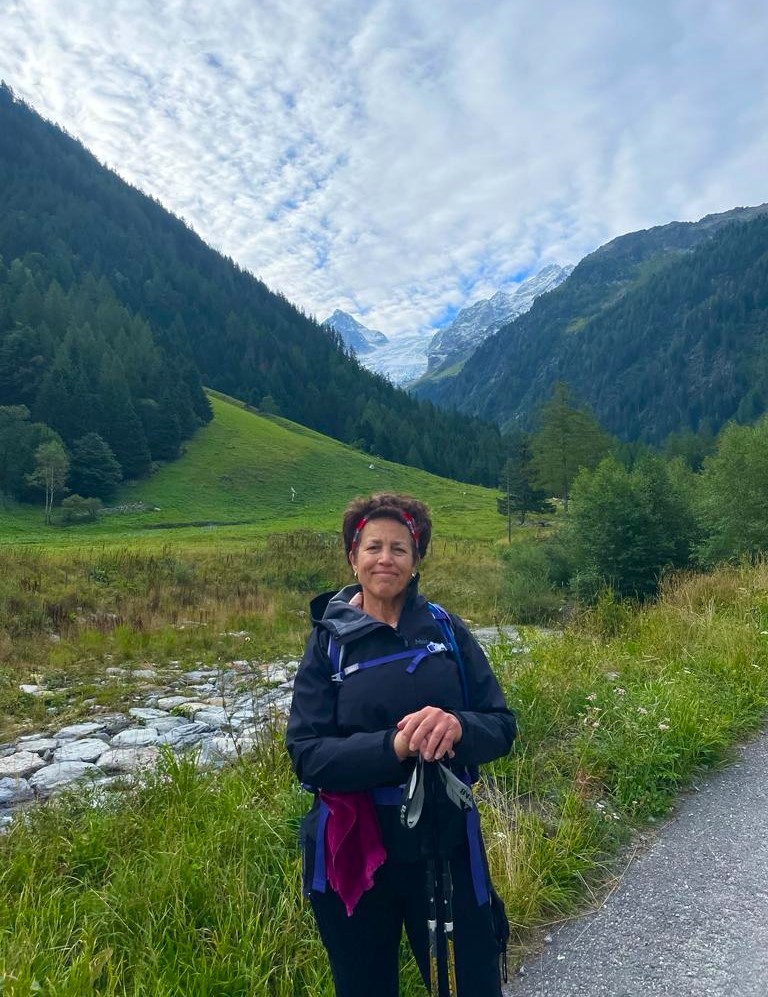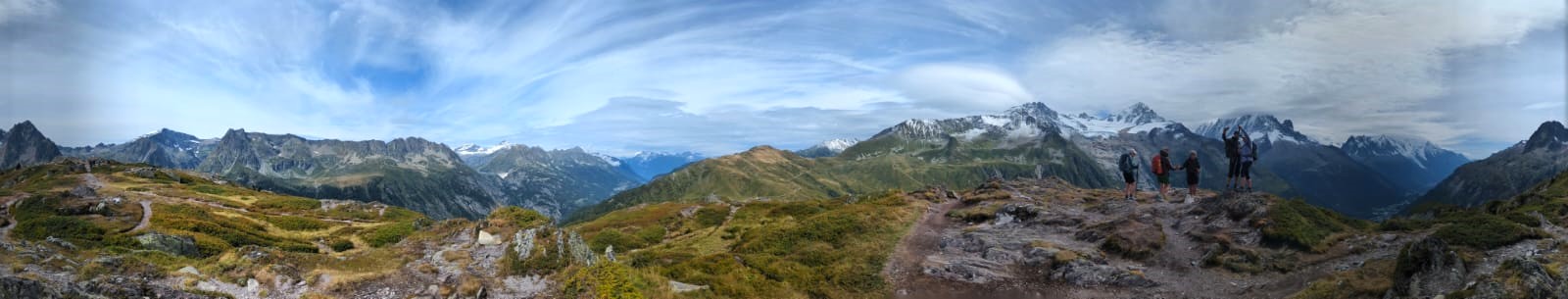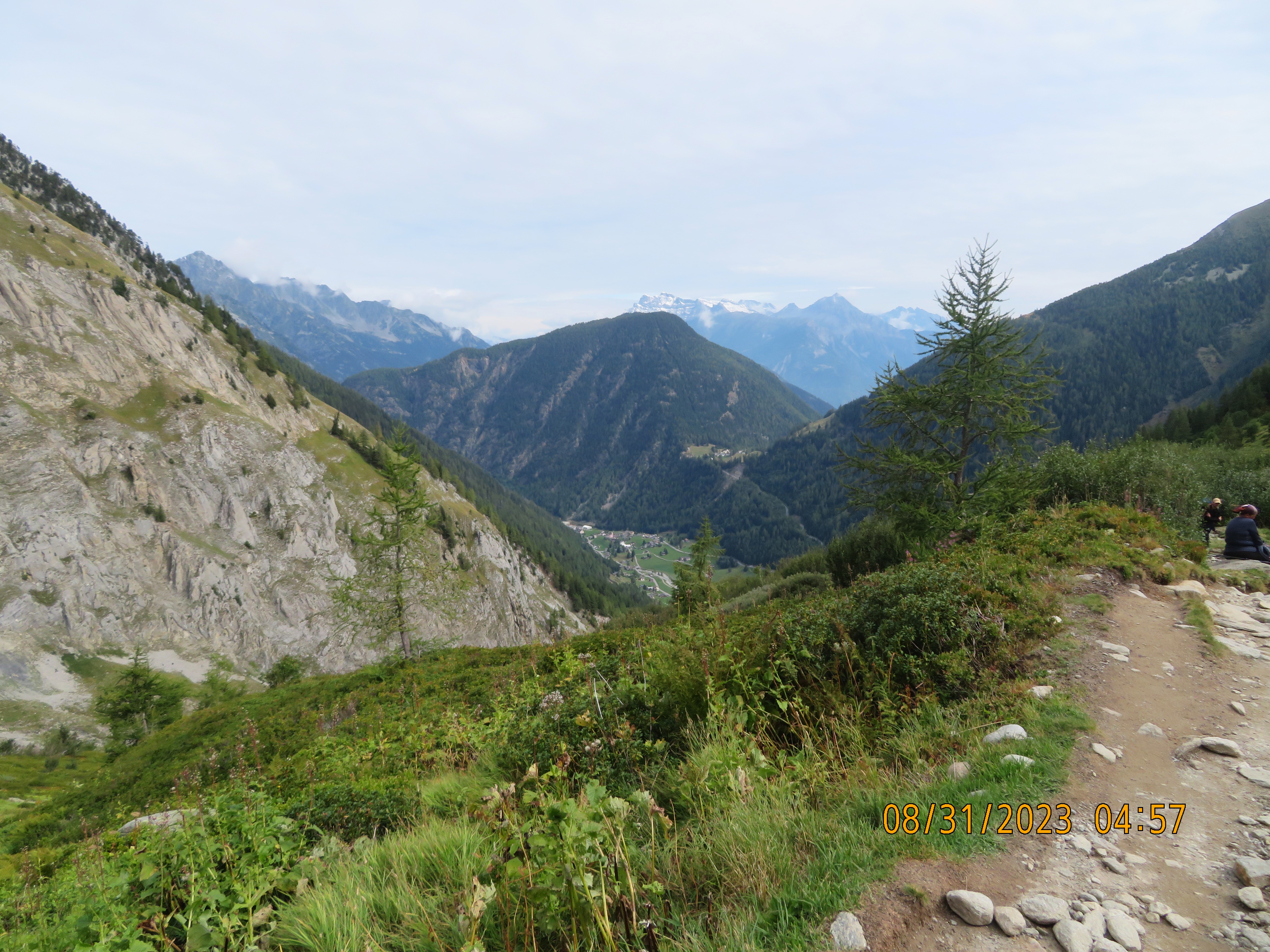 Next: Our last day, sunny and warm, takes us to Chamonix along a path that parallels Mont Blanc.