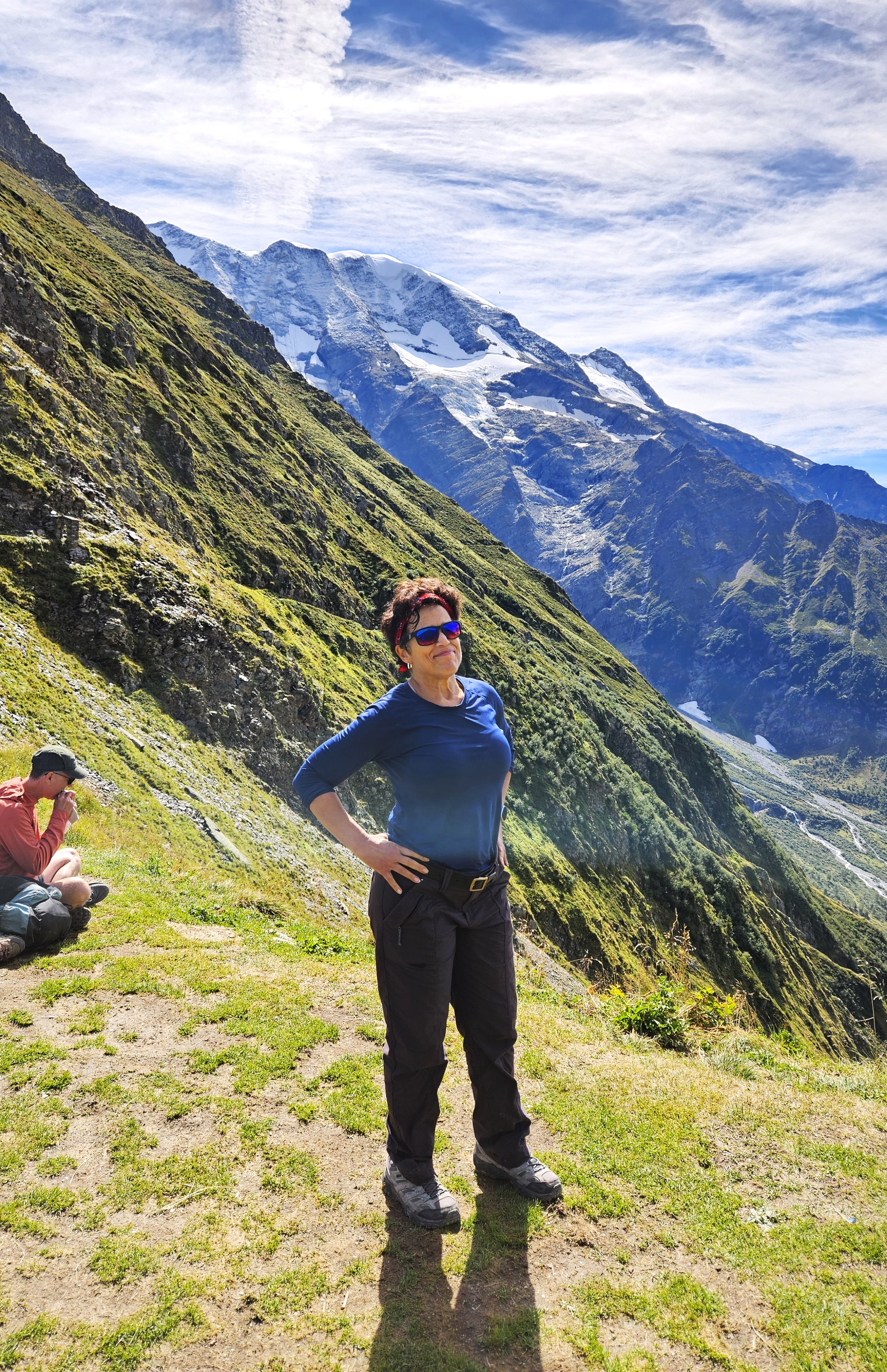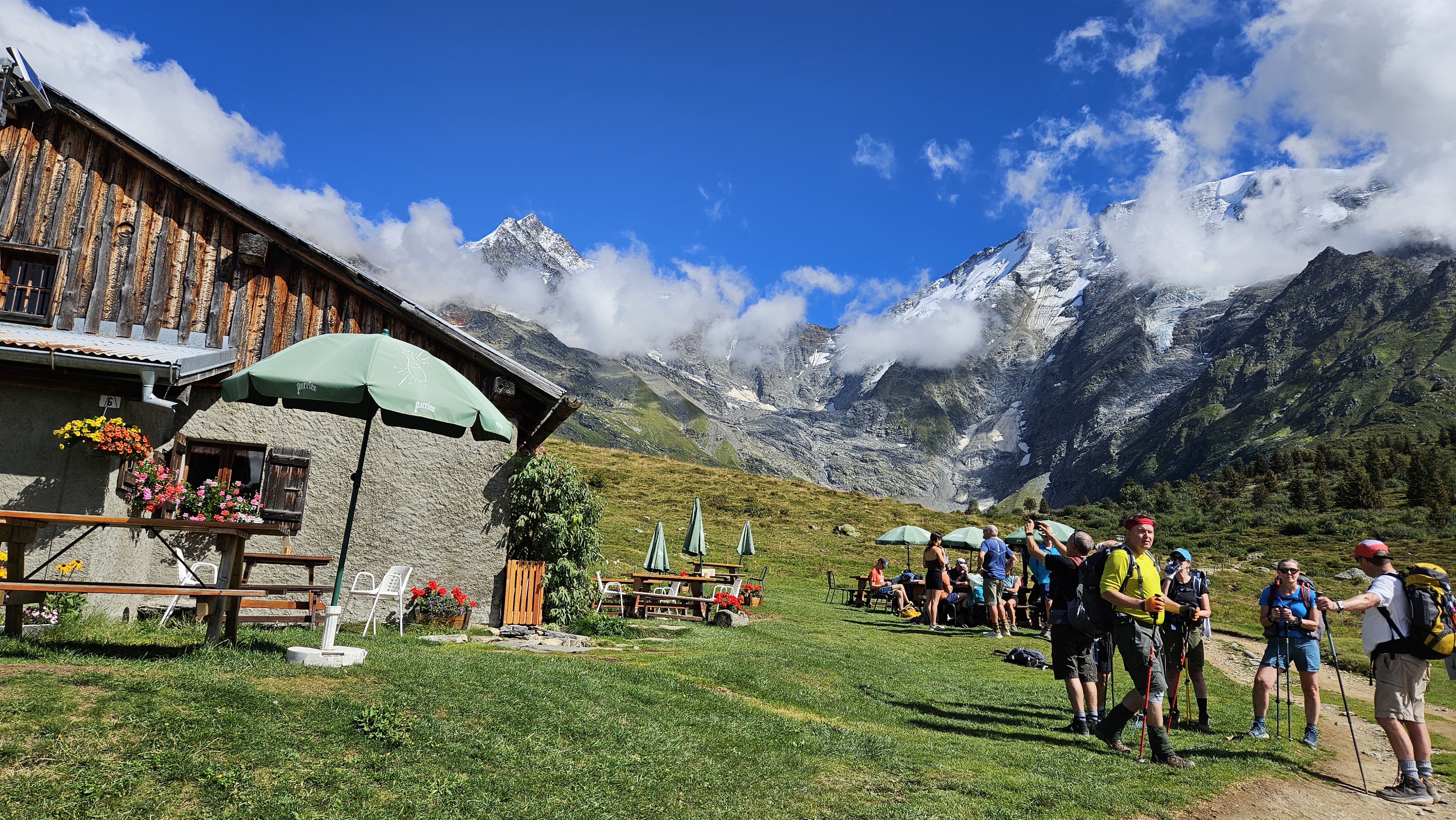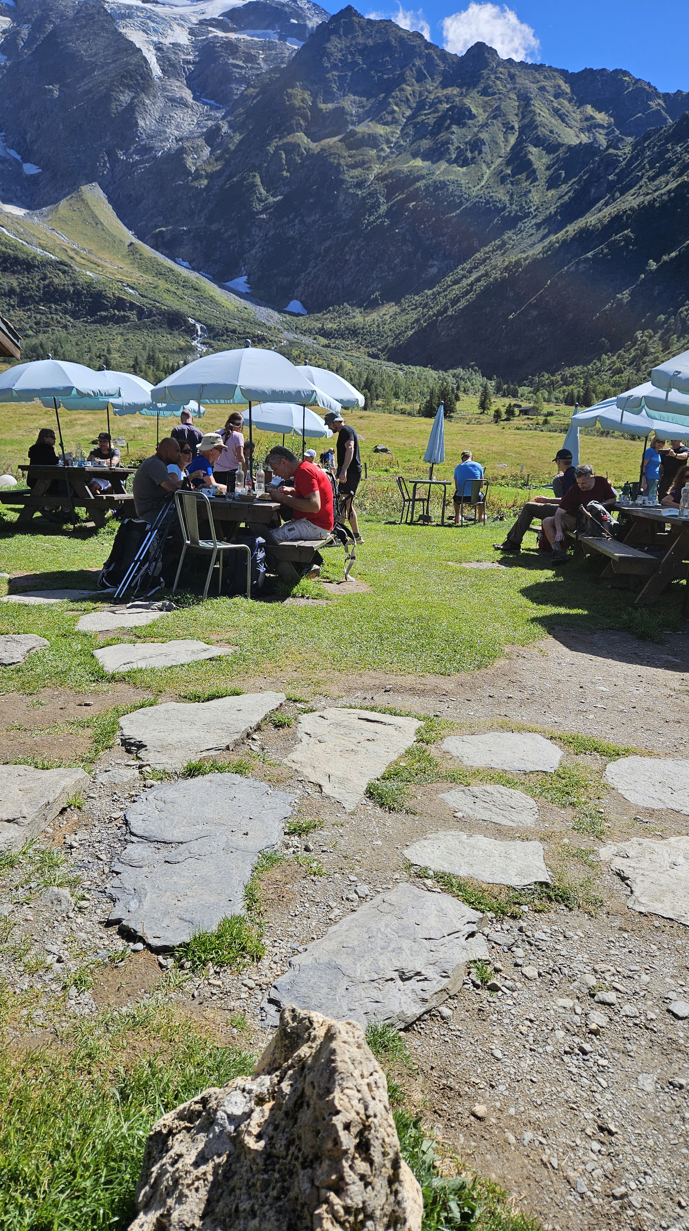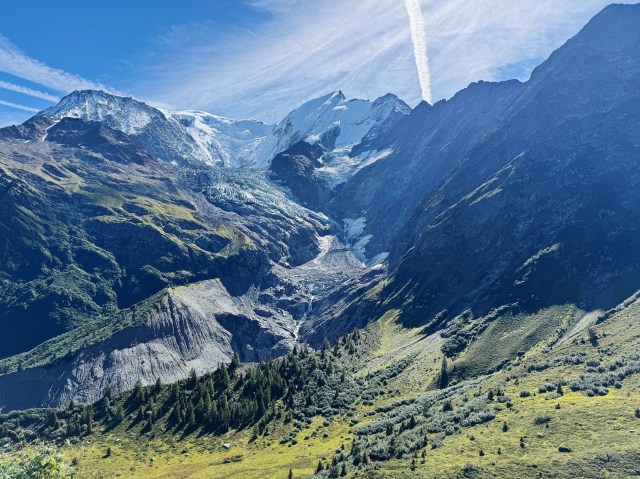 Itinerary for the day was an eight-mile trek, which included two big climbs. But part of it was also a stop on a ridge, the Col de Tricot, offering a pretty damn stupendous 360-degree view of the valley. From there, it was a steep, tricky descent down to the Refuge de Miage, famous for its blueberry pie. And then, you know, another climb and whatnot.