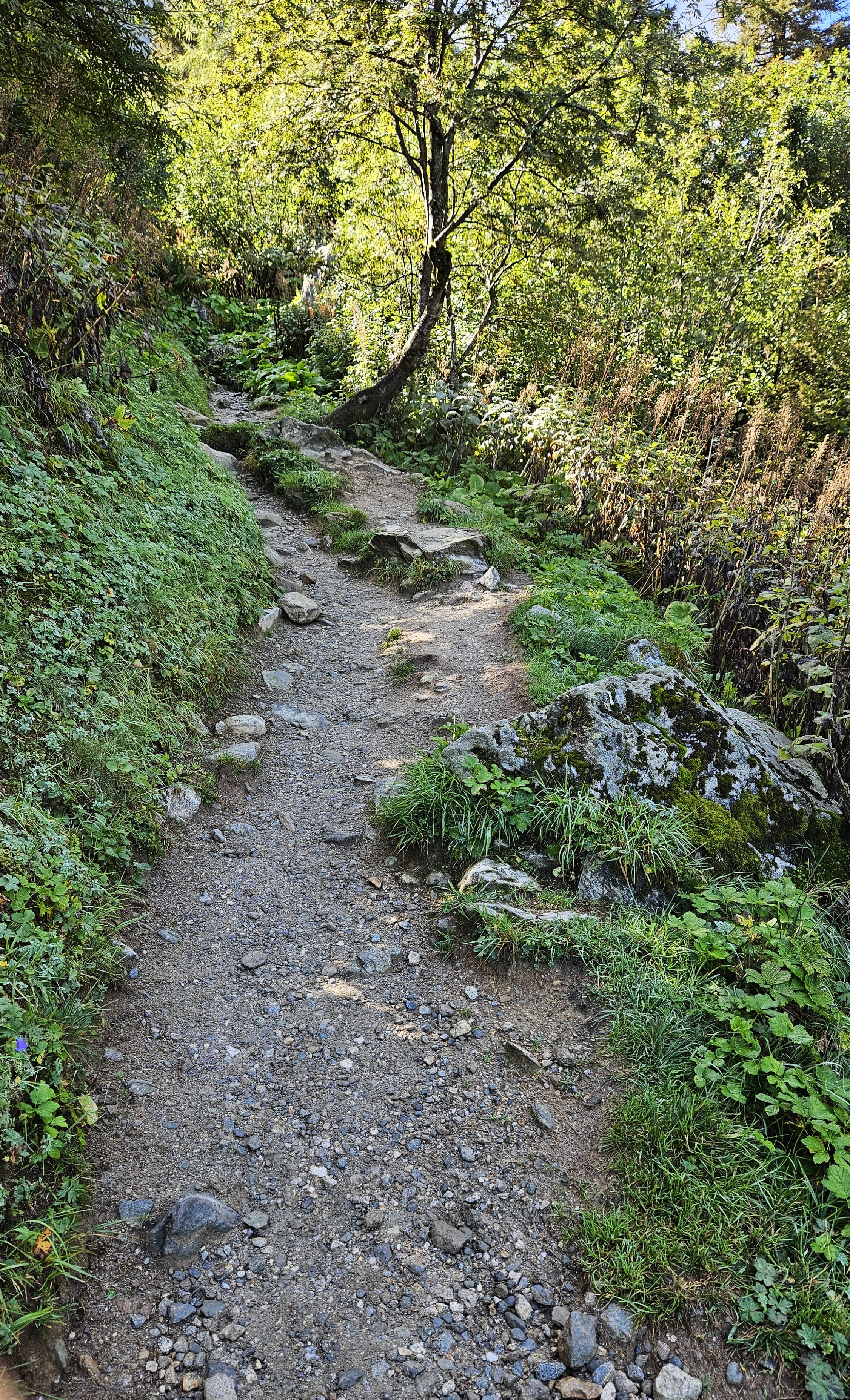 This was about the time my big toes started to ram against the end of my shoes with every step down. And that started to hurt. As I went, again, way behind everybody, I made friends with a group and their dog Spike. They apologized when he ran in front of me and I said, ‘No, Spike. Keep me company. Come back!” I said to a guy, “I see where we’re going but it never seems to get any closer.” “It’s an illusion!” he said and we laughed.