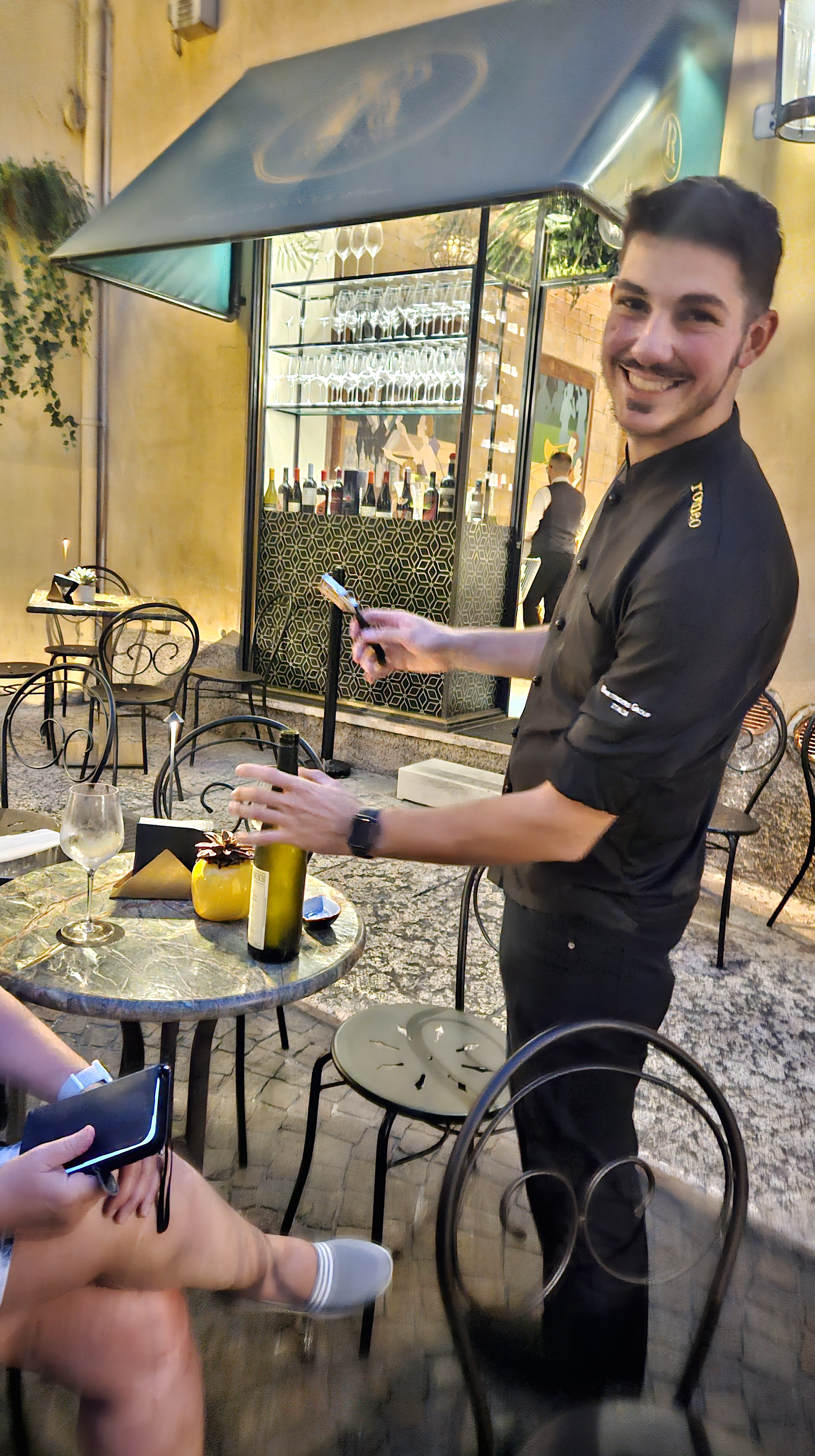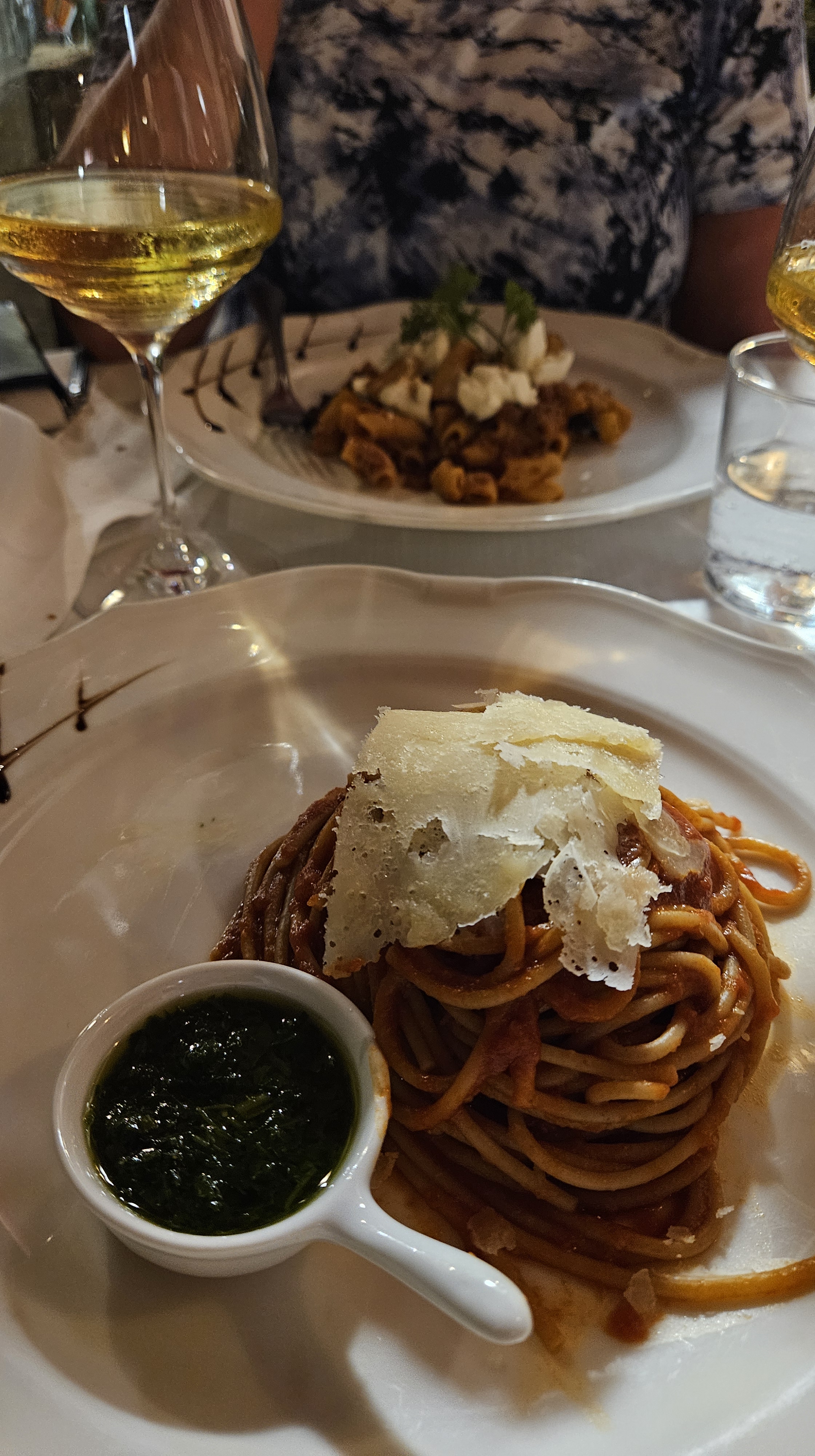 On our way back to the center of the city, we stopped at a recommended bar for an aperitivo. It was boring. No good food. We had one drink and went in search of another place. And we found Bar Romeo, which was great! Our waiter Francesco was chatty and fun. We had a few drinks, ate some snacks and wandered again until we found a great place for dinner, right next to a monument, in a piazza. One of the best things about wandering a city in Italy: you come across a great restaurant right next to a monument, in a piazza.