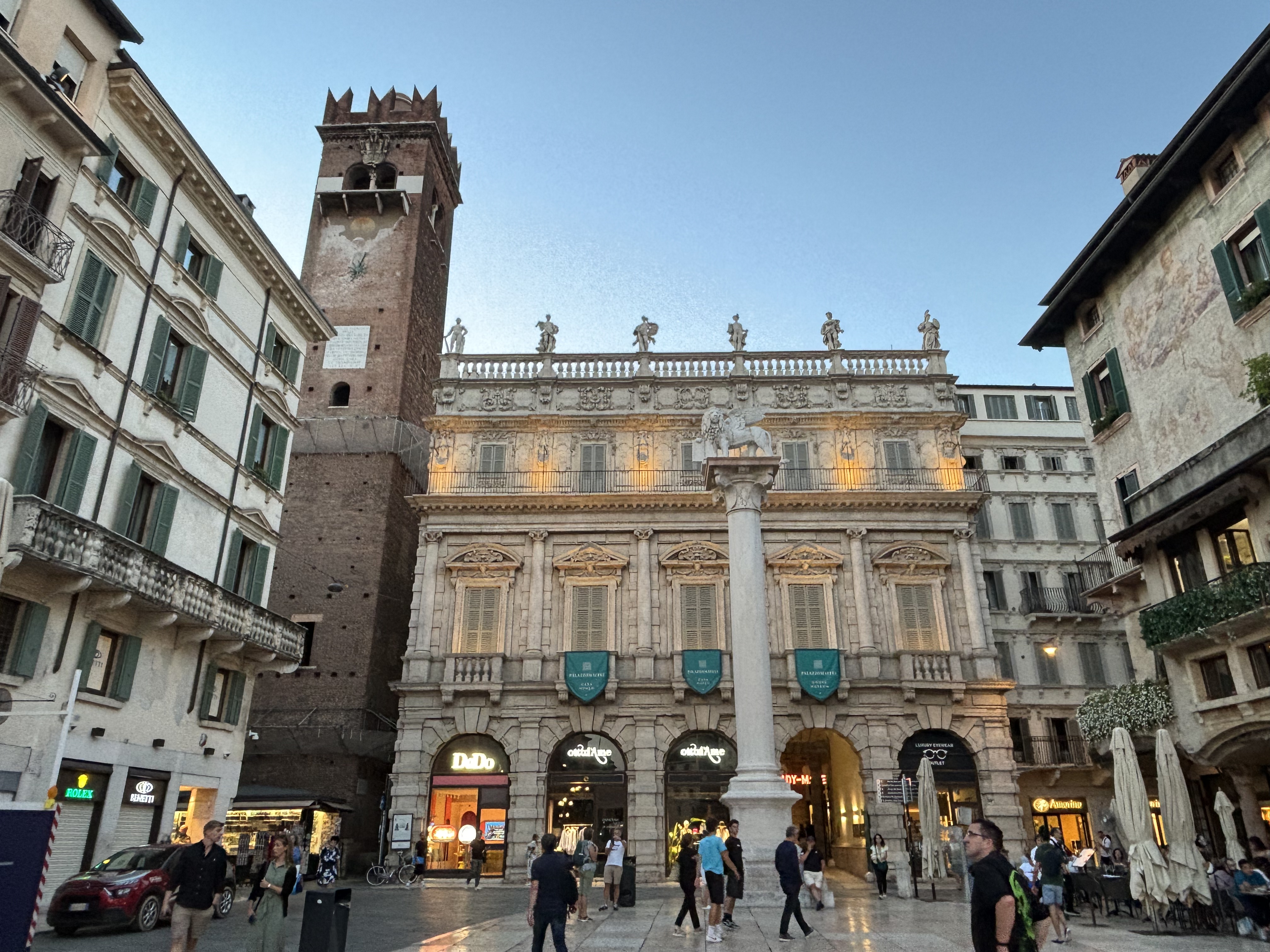 Two minutes from my door was Piazza delle Erbe, a very big square that holds an open air market every day. There’s just about everything for sale there: touristy T-shirts, refrigerator magnets, chotchkeys, placemats and even a big cup of fruit. In the evening, the booths close up, the tourists are gone and the piazza turns into a much quieter and calmer place to maybe have an aperitivo or even dinner.