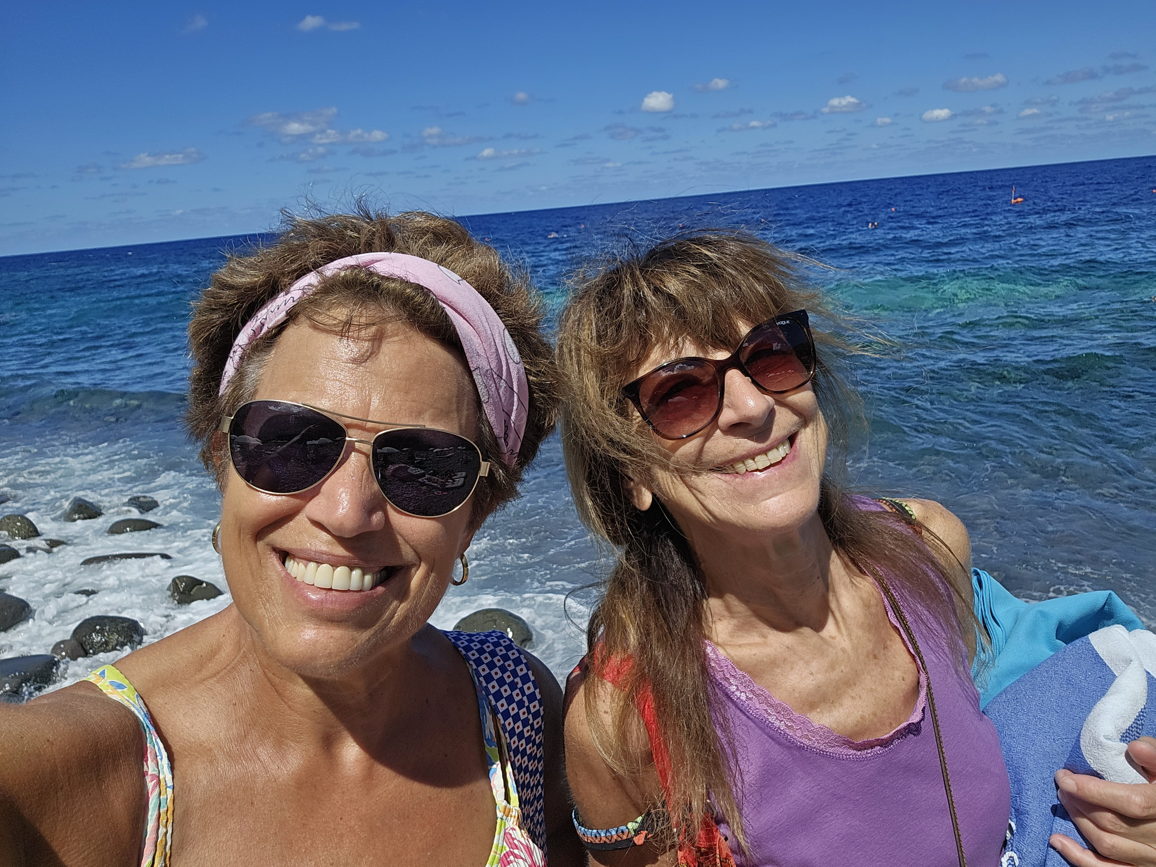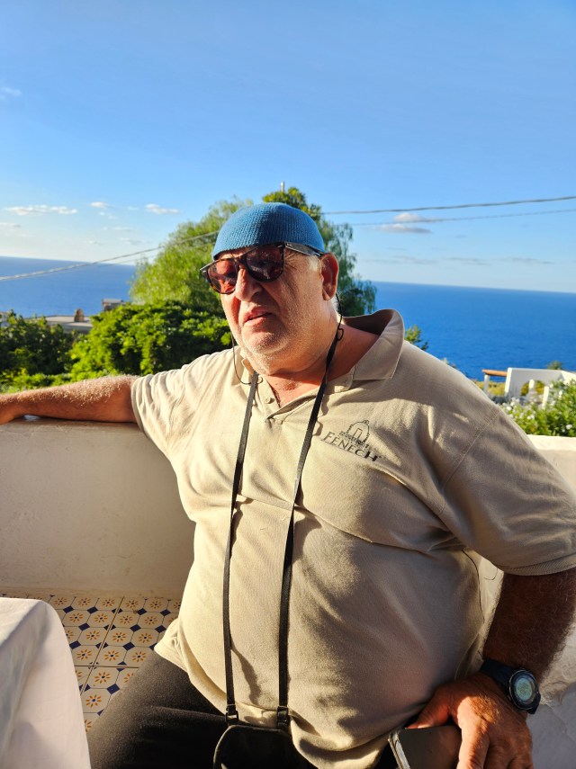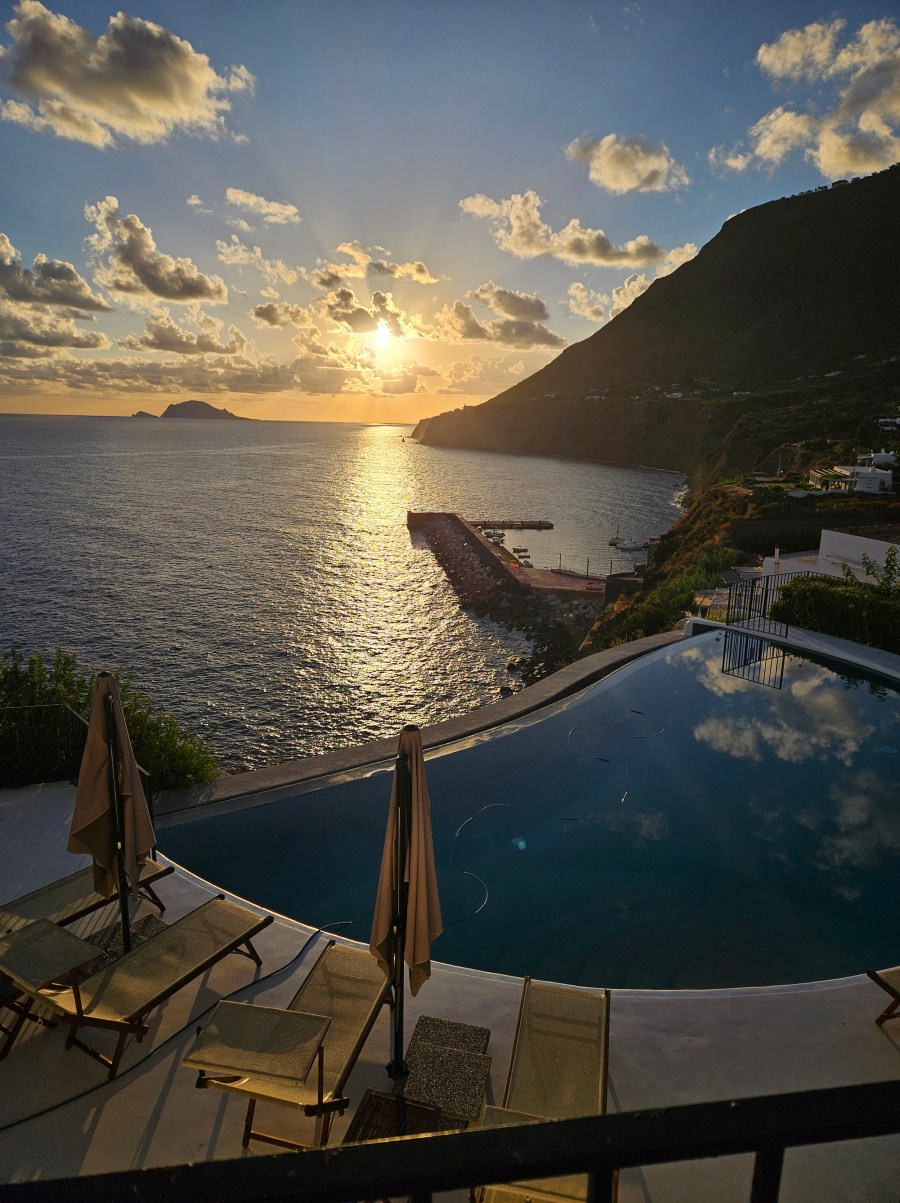 The first part of the itinerary was four days on Salina, one of a group of seven volcanic islands that sit north of Sicily in the Tyrrhenian Sea. I chose Salina, and the village of Malfa, on a whim. The hotel was the second listing on Booking.com and it was very very nice. My friend Paola, who lives in Bologna, met me there. She took the overnight ship from Naples. I was still two hours away when she sent me a photo of herself at the hotel pool.