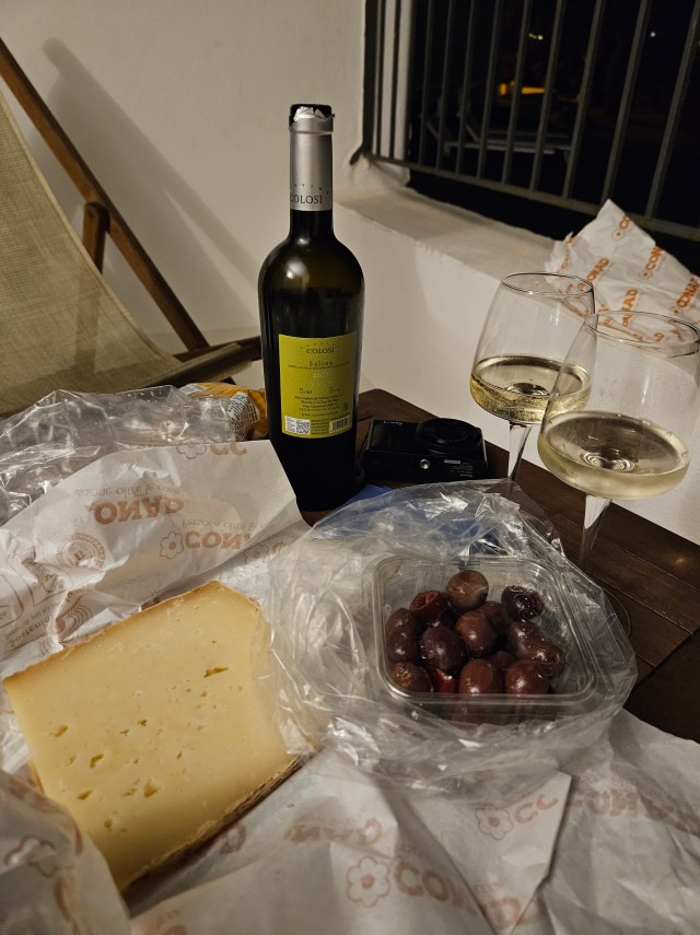 We ate lunch and laughed at the madness of the day. What would have then been ideal was calling a taxi to take us back to the hotel. Not happening. It was an hour wait, if we even found one. OK. We’ll just take the bus back to Malfa. And, drumroll. . .the next bus arrived in an hour. Perfect! We got back to Malfa, stopped and picked up cheese, olives, bread, wine and ate in the room. We watched the sunset again and then called it a night.